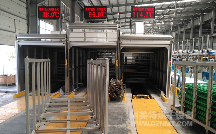 每個小車分10層堆放日豐管,每層放6包,則每車可放60包,每包重約28KG,烘烤區域分3個獨立通道,可以單獨控溫,每個通道烘烤區可以放置6輛小車,每個通道每20分鐘出一輛小車,小車自動進出。小車由客戶自行設計制作。